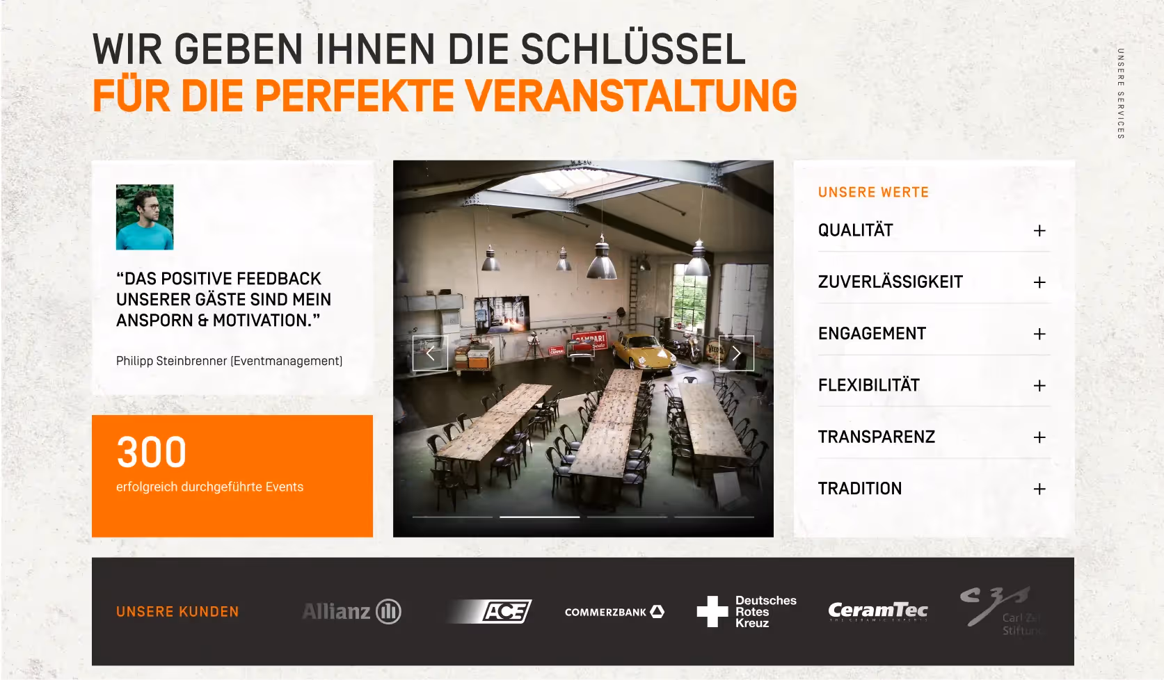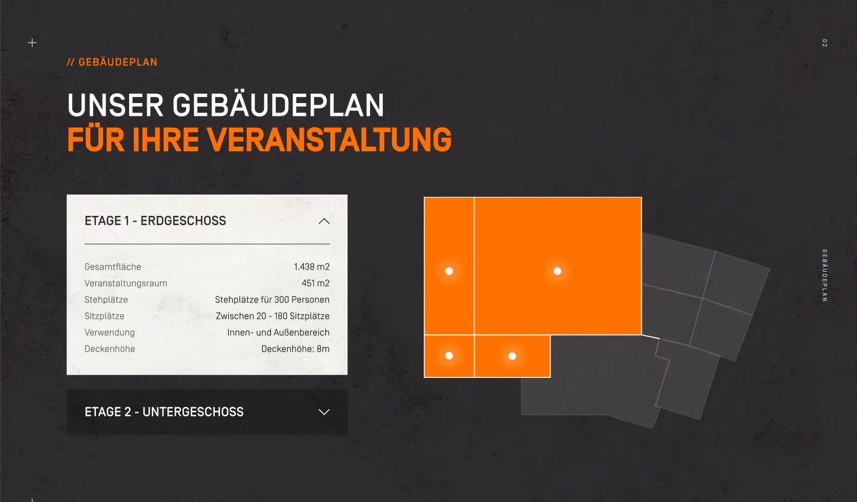 In addition to the new design, the focus was on improved functionality: an extended contact form facilitates inquiries, an interactive building plan shows rooms and capacities, and photos and videos convey the special atmosphere. The site is rounded off by two targeted landing pages for the main use of the location: events and film and photo productions - each individually tailored to the respective target group.