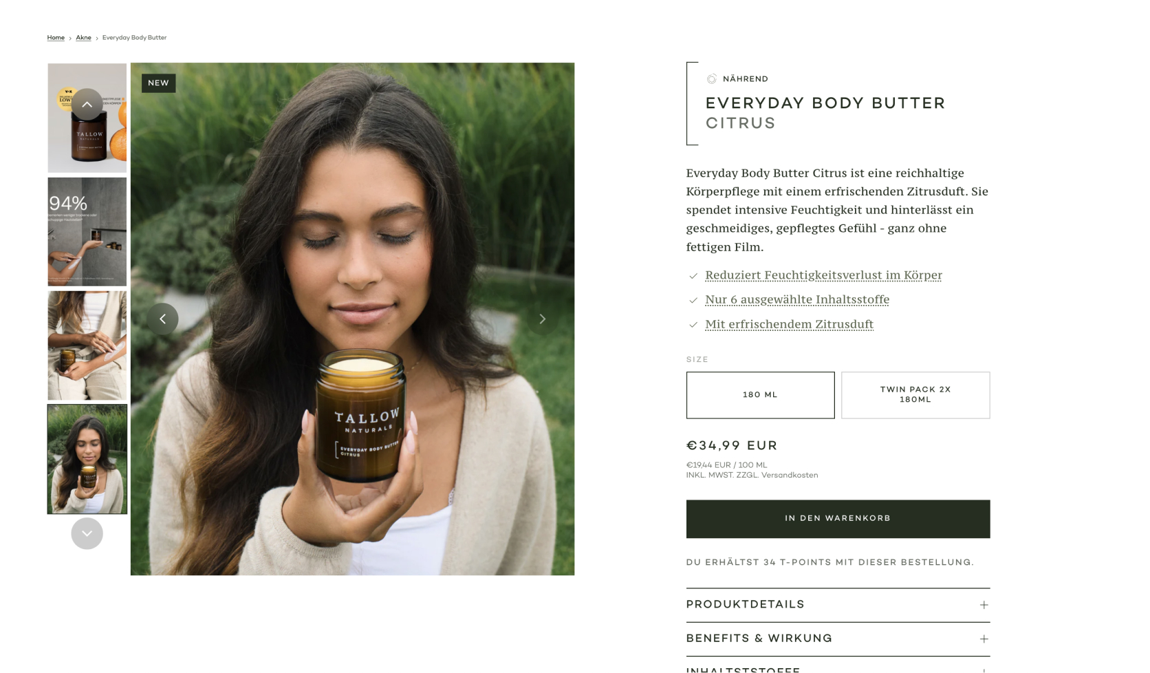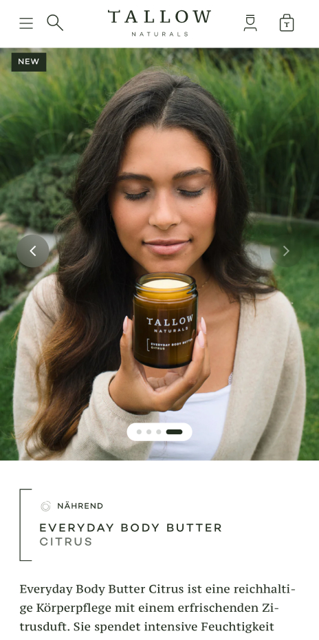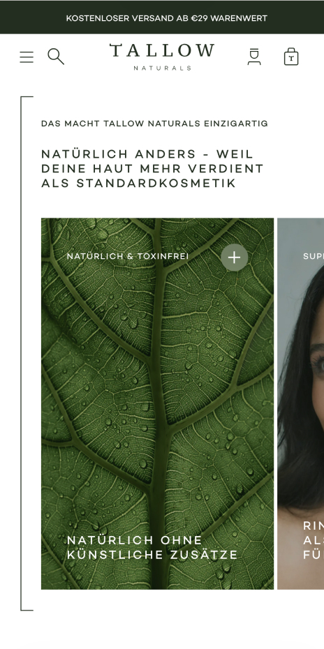 Tallows Naturals was faced with the challenge of further developing the brand digitally. The goal was clear: to create a high-quality aesthetic that reflected the natural quality of the products without sacrificing conversion and performance. At the same time, the new online store needed to focus more on storytelling, user-generated content and targeted cross-sells and upsells.