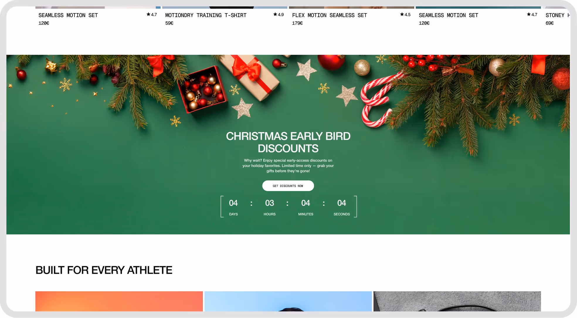 Update your homepage with a warm Christmas banner, sprinkle seasonal elements such as snowflakes or gift icons across your website and adapt your color palette to warmer tones such as dark red, pine green or gold. Don't forget to design product pages and the checkout process in a festive style too: This creates a consistent, inspiring experience that makes Christmas shopping exciting and memorable.